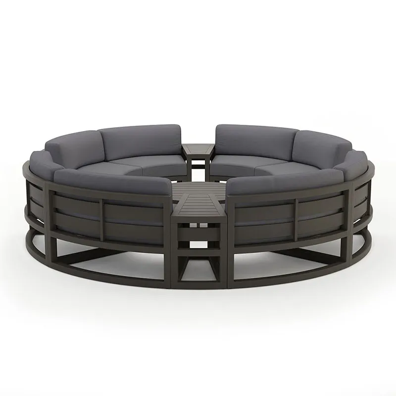 Canapeaua circulară de exterior nu este doar o piesă de mobilier funcțională; este un plus transformator pentru orice zonă de locuit în aer liber. Forma sa unică și cadrul robust din aluminiu îl fac o alegere remarcabilă pentru cei care doresc să-și îmbunătățească decorul exterior cu ceva care combină stilul modern cu confortul și durabilitatea excepționale.